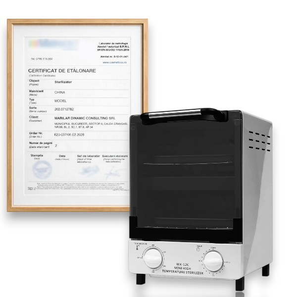 Sterilizatorul este inscripționat CE și este livrat cu documentație completă, incluzând certificatul de etalonare, certificatul de conformitate și instrucțiuni de utilizare în limba română, fiind un echipament profesional destinat utilizării în condiții de maximă siguranță și conformitate.